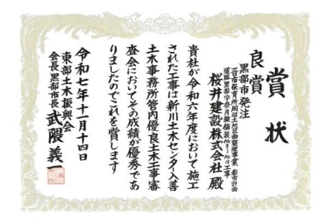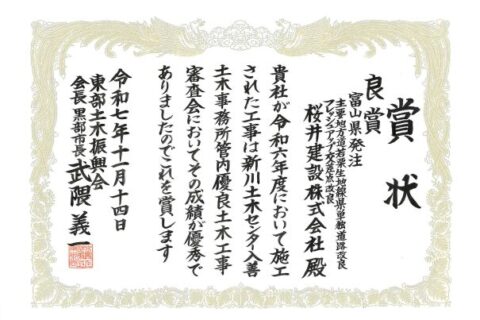 令和7年度 富山県新川土木センター入善土木事務所管内優良土木工事表彰式において良賞を受賞しました