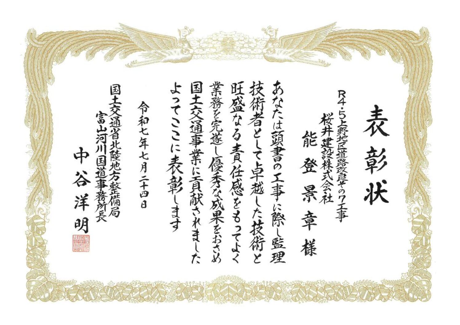 令和7年度 富山河川国道事務所国土交通事業関係功労者等表彰式おいて優良建設技術者を受賞しました