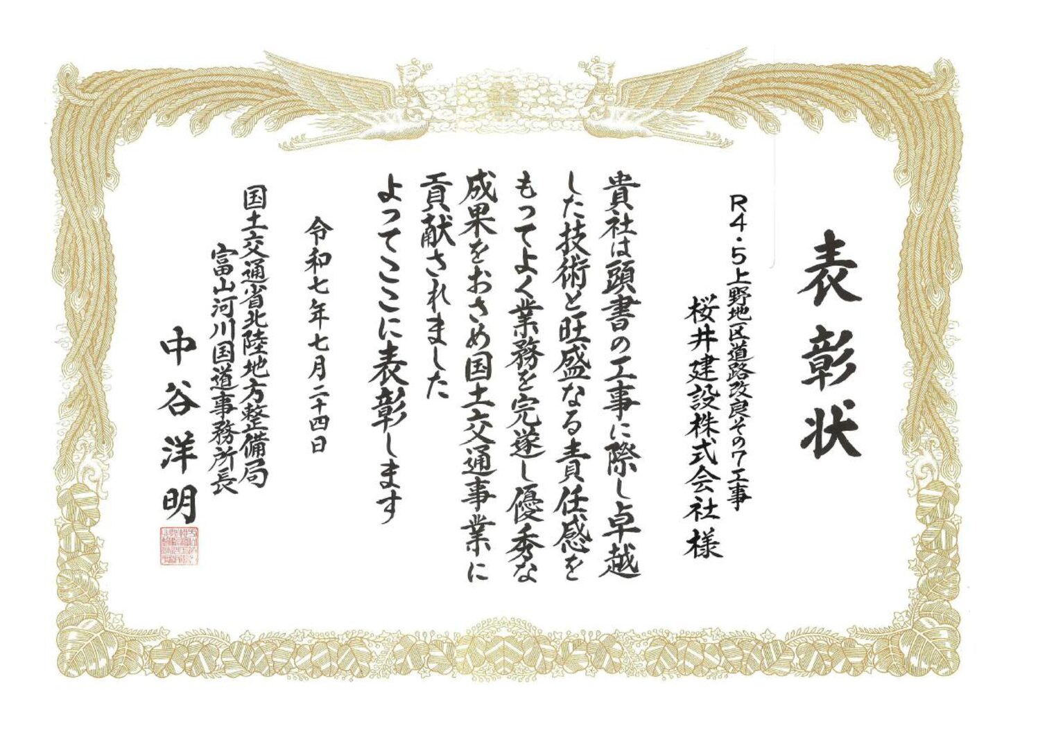 2025.11.17 令和7年度 富山河川国道事務所国土交通事業関係功労者等表彰式おいて優良工事賞を受賞しました お知らせ 令和7年7月24日に富山市ボルファートとやまにて令和7年度 富山河川国道事務所国土交通事業関係功労者等表彰式が開催され、令和4・5年上野地区道路改良その7工事が優秀な成績をおさめたとして優良工事賞を受賞しました。 詳しく見る
